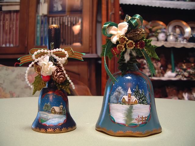 木の実やスパイスを使ったリースやツリー,そして冬景色を描いた陶器のベルは新作です。