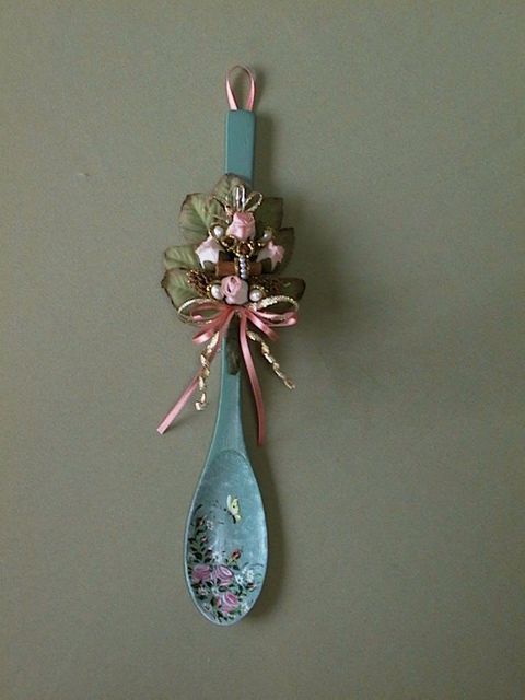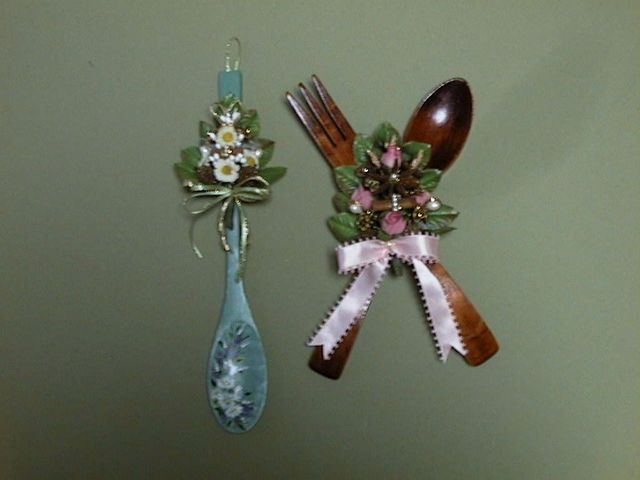 下地色を塗り,花と蝶をペイントして,アレンジメント飾りをつけたスプーンと,サーバーをクロスさせた部分にお花のアレンジメント飾りをつけた小物です。