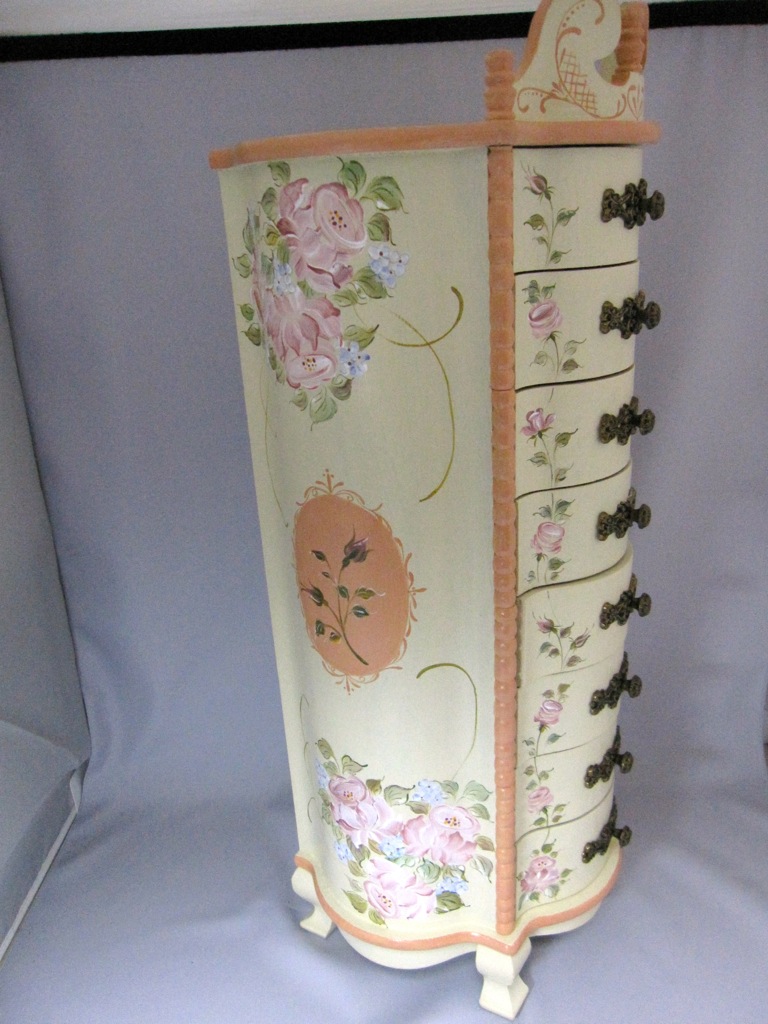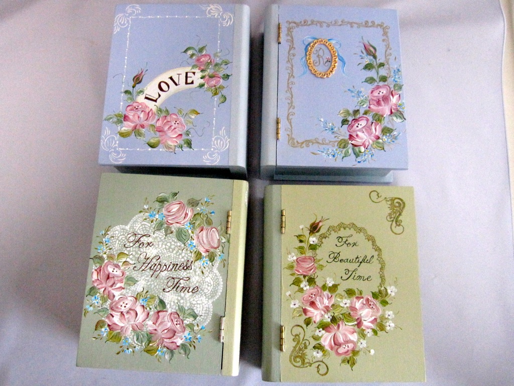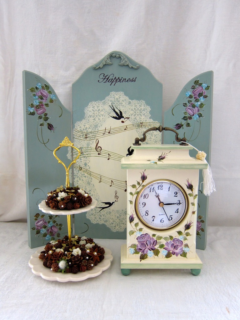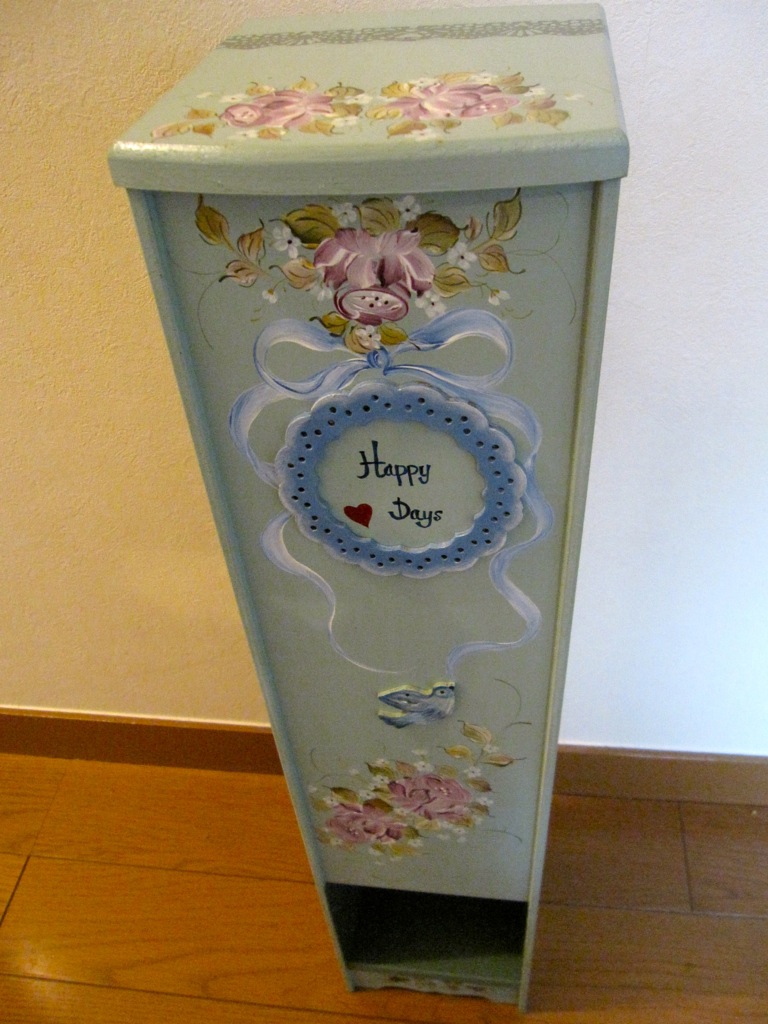 ちなみにアッセンデルフトとは17世紀にオランダで生まれたフォークアートで花や果物,鳥などの代表的なモチーフをすべてひと筆描きの要領でのびのびと描き,その色合いや重厚感などが楽しいペインティングです。木製品の生活小物をはじめ,あらゆる身の廻りのものから家具のリフォームまで多種多様です。