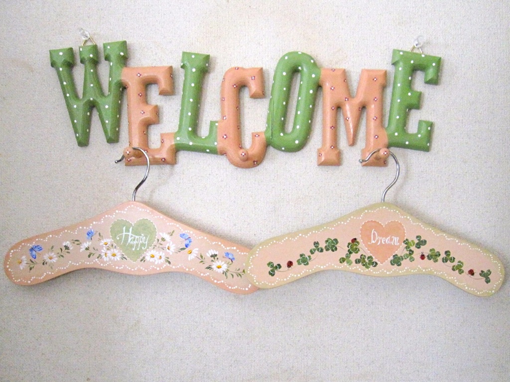 ポップで可愛いウェルカムボードのフックにかけた子供用ハンガー。