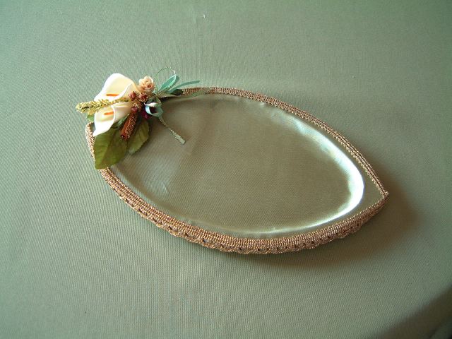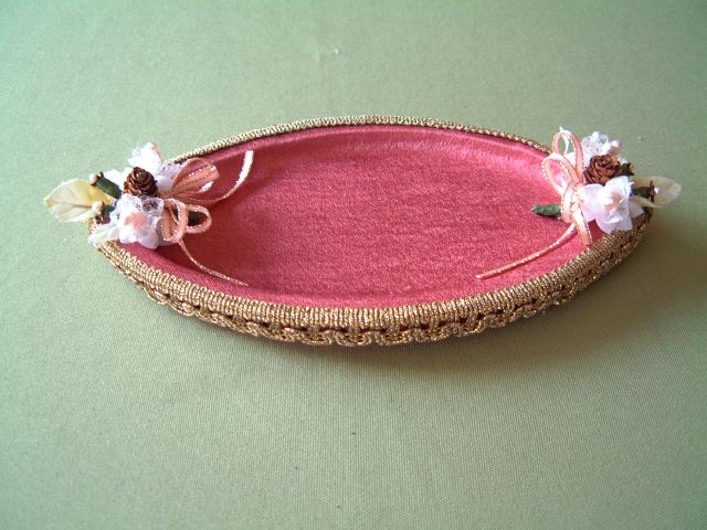 形がきれいな100円ショップの木製のミニトレーには,光沢のある生地を張り,周囲をブレードでくるんでアレンジした飾りをつけます。時計やアクセサリーを乗せるのにぴったりです。