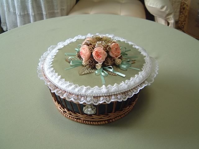 芒草で出来た直径19cmのやや大きめのバスケットにもレース飾りのフタを作り,ブリヨンとパールで作ったメタルフラワーを中心に造花やグローブのアレンジメントを飾って…。