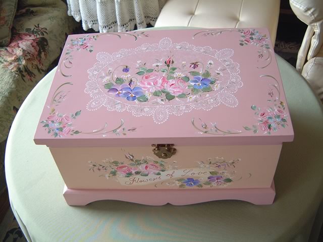 大ぶりのチェストは淡いピンクの地色にレースを合わせ,ロマンティックに仕上げました。結婚のプレゼントなどにも最適です。