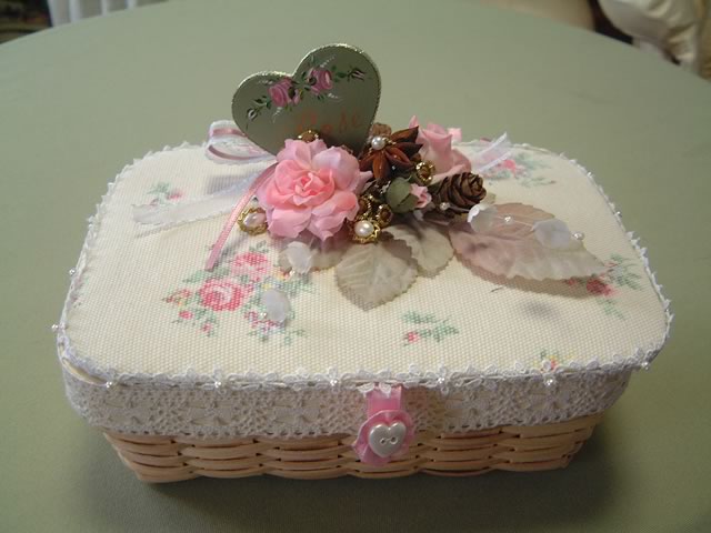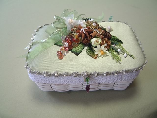 20cmの杉素材のバスケットは一方を白くペイント。各々にフタを付け,バラとぶどうをイメージしたパーツをアレンジしました。
