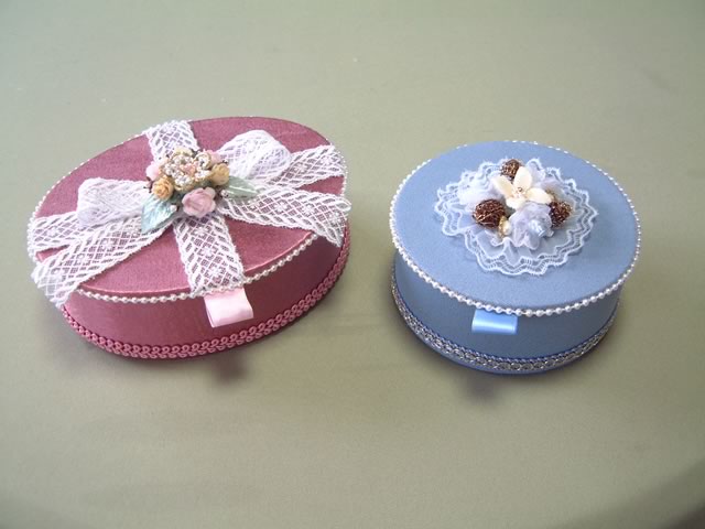 薄いポプラ樹皮でできたラウンドボックス2種に光沢のある布を張り,レースとブレード,パールでよりロマンチックに。