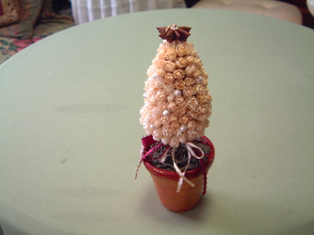 高さ6.5cmの鉢を赤いゴールドにペイントし,150個前後の小さなタラマックコーンをサラハに刺してホワイトツリーに。