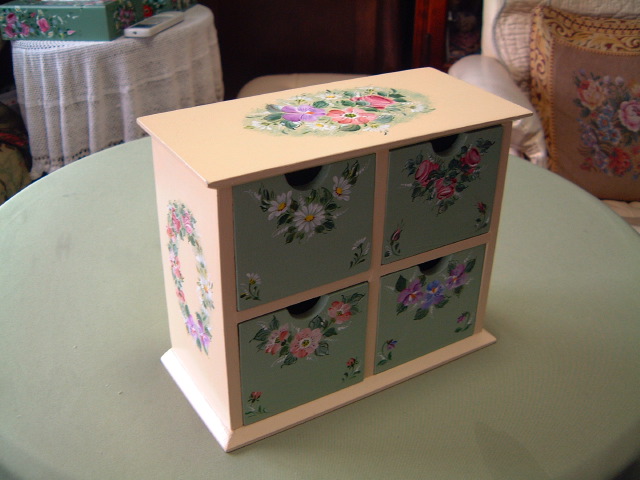 ちなみにアッセンデルフトとは17世紀にオランダで生まれたフォークアートで花や果物,鳥などの代表的なモチーフをすべてひと筆描きの要領でのびのびと描き,その色合いや重厚感などが楽しいペインティングです。木製品の生活小物をはじめ,あらゆる身の廻りのものから家具のリフォームまで多種多様です。