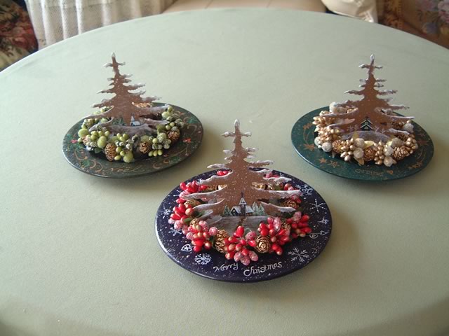 高さ9cmのもみの木型のアイアンのキャンドルスタンドに雪の風景を描き,木の実を飾ったクリスマス柄のミニプレートと組み合わせて。
