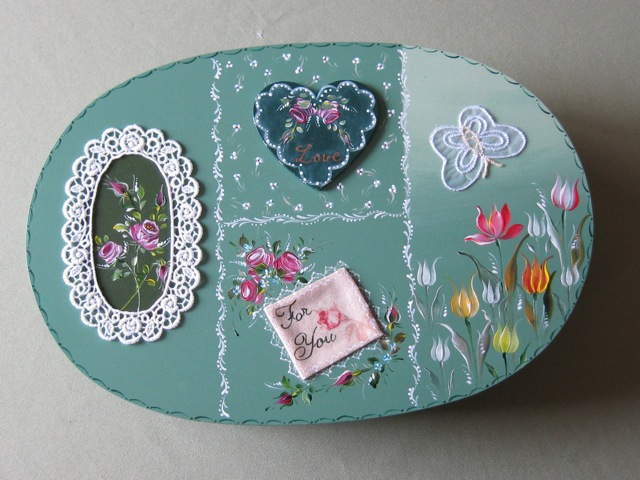 広いフタの部分はレースのモチーフやプリント地,ハートのミニオーナメントなどとペイントを組み合わせてコラージュ風に。