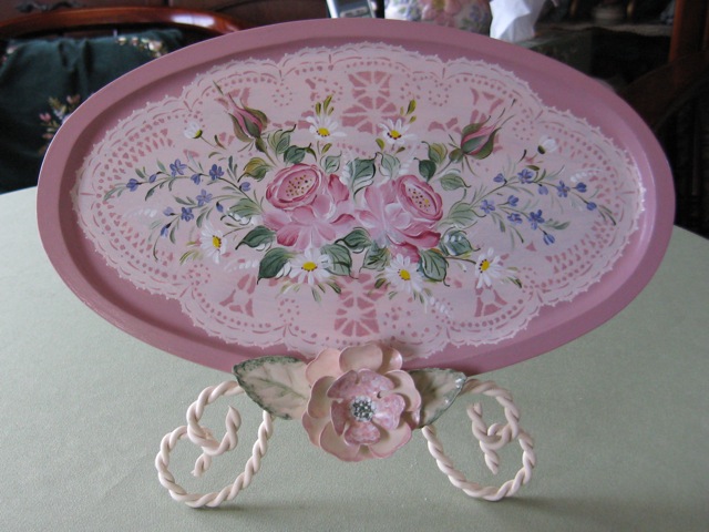 レースをステンシルしてエレガントさをアピールし,アイアンのイーゼルのお花もピンクでペイント。