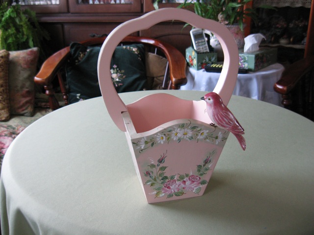 ピンクづいた流れで描いたフラワーバスケットにもピンクでペイントした小鳥を止まらせて。
