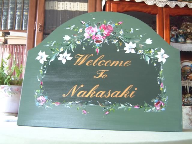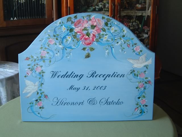 先月嫁がれた生徒さんに贈った,48x38.5cmのかなり大きなウェディングボードです。彼女の希望のサムシングブルー地にバラとリボン,そして白い小鳥が2羽のデザイン。表だけではと思い,裏面もシンプルに描いてみました。