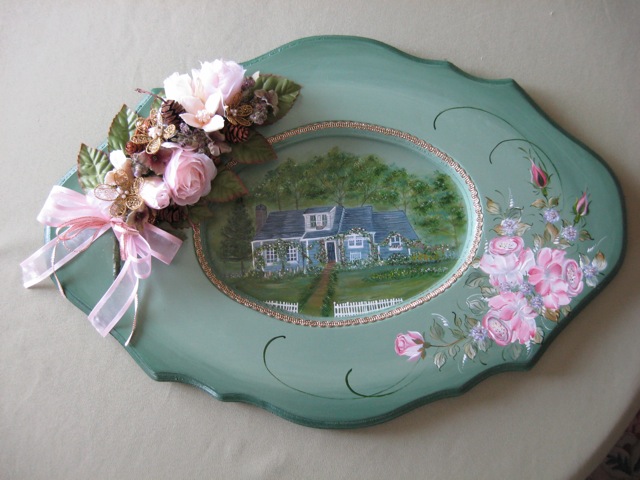 奥行きのある中央にはバラで覆われたコテージを描き,周囲はバラのペインティングとバラと木の実のスオップをコラボして。