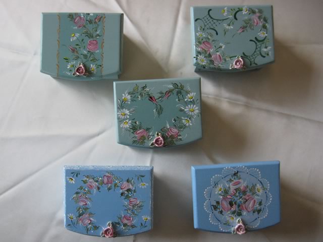 手の平サイズの小箱はバラのつまみをアクセントに,すべてバラとマーガレットのパターンで。