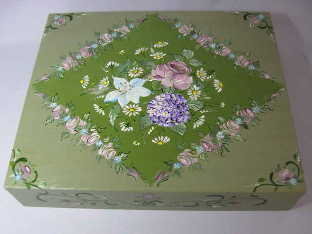 ちなみにアッセンデルフトとは17世紀にオランダで生まれたフォークアートで花や果物,鳥などの代表的なモチーフをすべてひと筆描きの要領でのびのびと描き,その色合いや重厚感などが楽しいペインティングです。木製品の生活小物をはじめ,あらゆる身の廻りのものから家具のリフォームまで多種多様です。