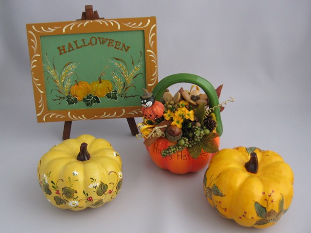 市販のグッズも利用してハロウィーンの楽しいデコレーション。オレンジ色の彩やかな陶器製のバスケットを中心に,プラ樹脂のカボチャも色塗りし,どんぐりと木の実をペイントして。