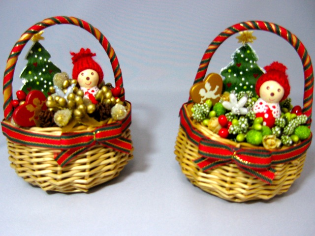 ミニバスケットに刺したお人形やツリーは市販のものを作り変え,クリスマスのデコレーションに。