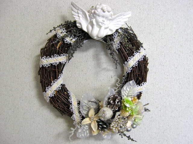 天使をアクセントにアレンジメントも白でまとめて品良く。
