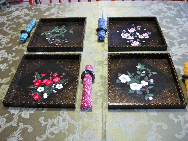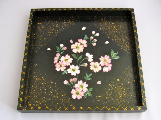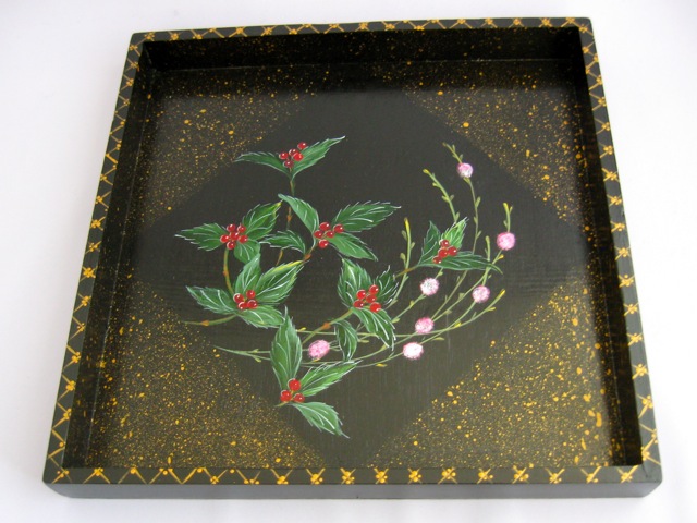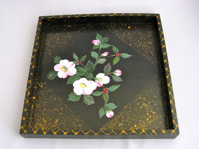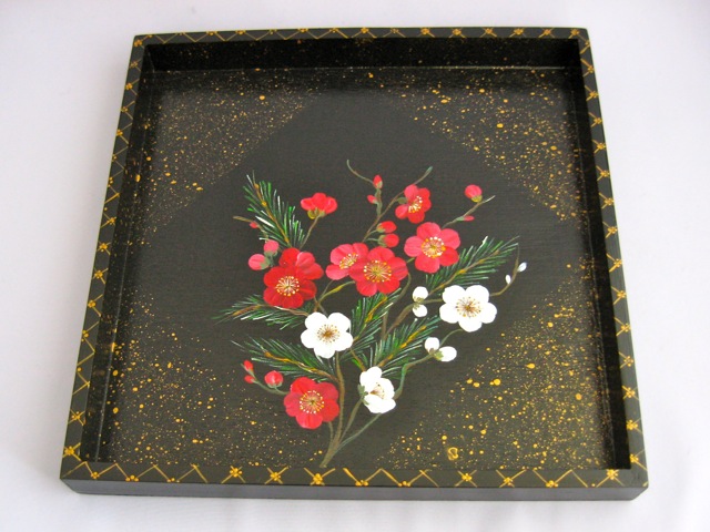 お正月らしく紅白梅,椿,桜,若竹,千両など和花をアッセンで描いた和風テイストの角盆。