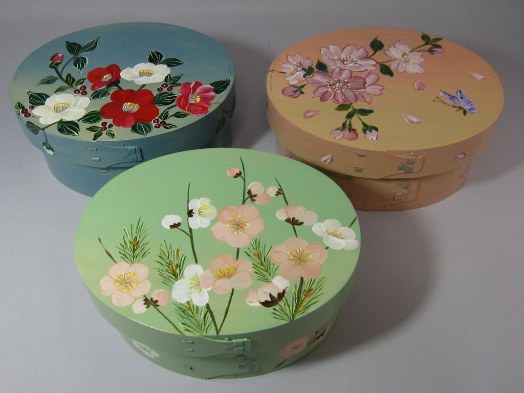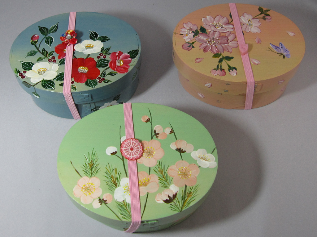 グラデーションの下地に桃,桜,椿を描いた曲わっぱのお弁当箱。ピンクのゴムでフタ止めも手作り。