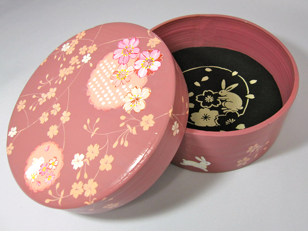 桜とうさぎをモチーフにしたピンク地は,内底も桜とうさぎのプリント地を張って。