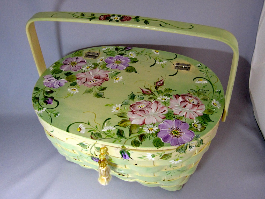 大好きなバスケットは,アイボリーに淡いグリーンをたたいて五月のバラのイメージで。