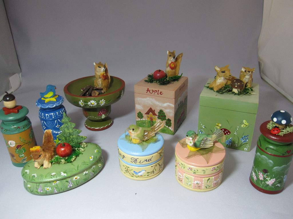 いつの間にか集った手の平サイズの小物入れに木彫りの動物たちをプラスして,小さなオブジェの完成です。