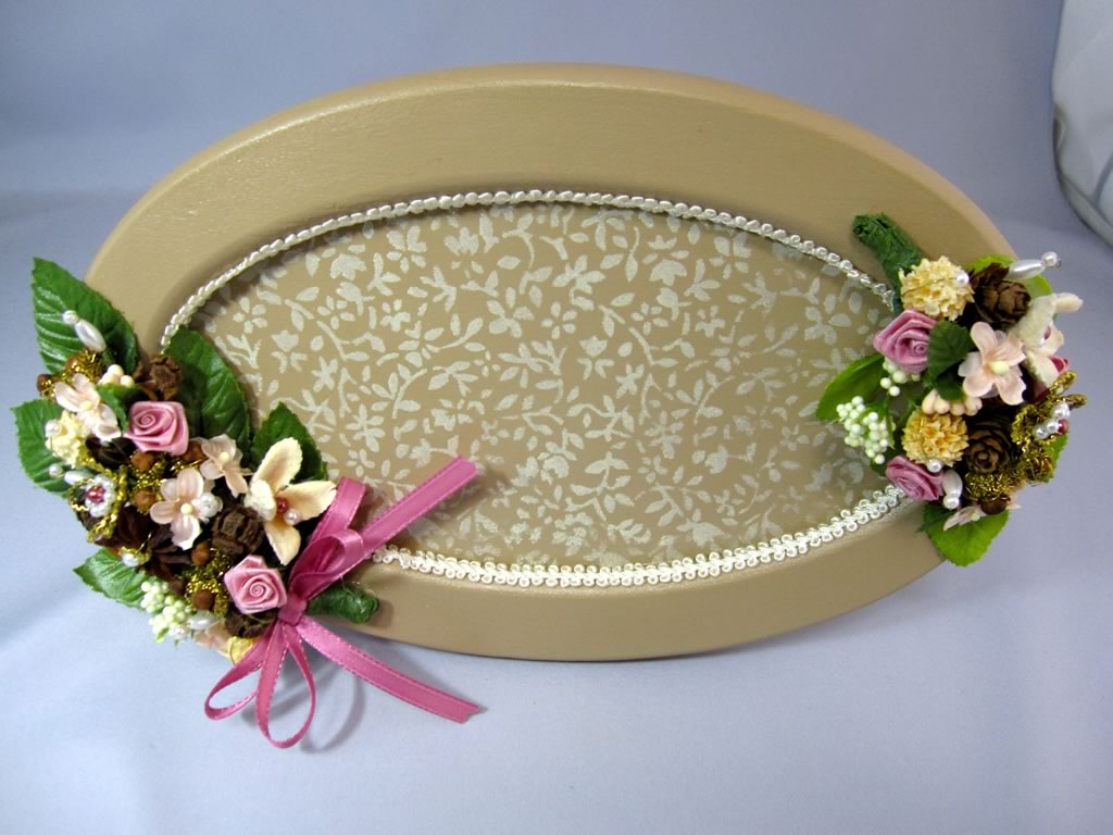 ステンシルしたミニトレーの両サイドにアレンジメントした飾りやブレードをほどこし,インテリア小物に。