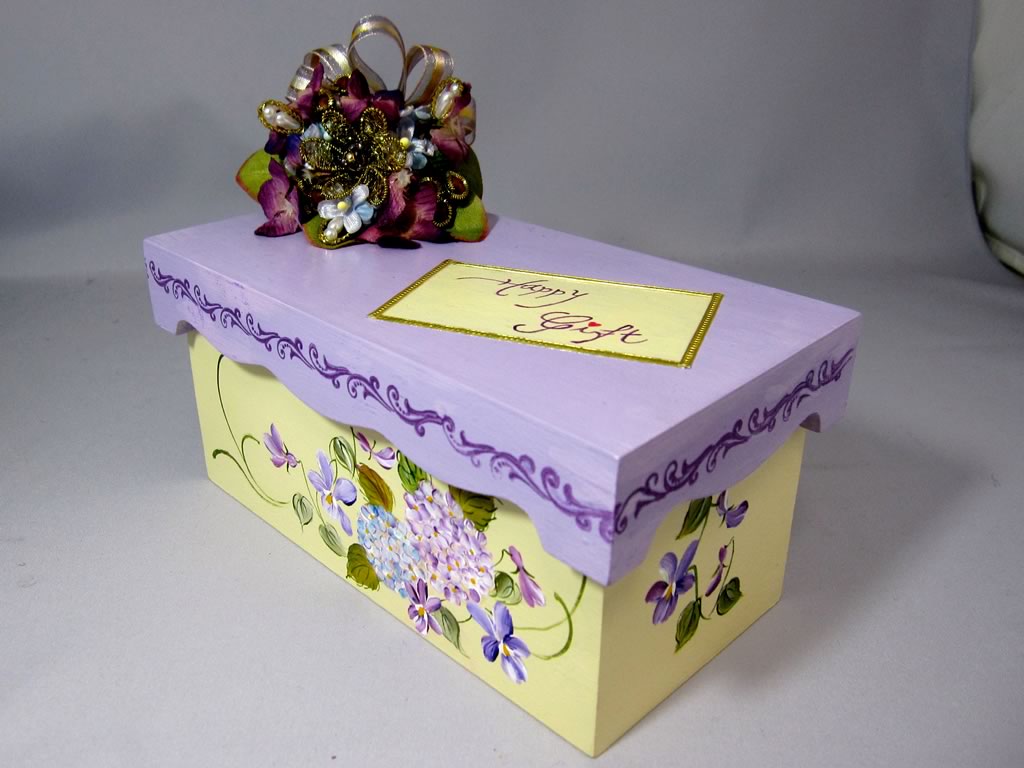 フラワーアレンジメントをコラボさせた小箱は,フタのカットがエレガント。