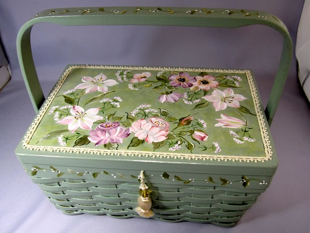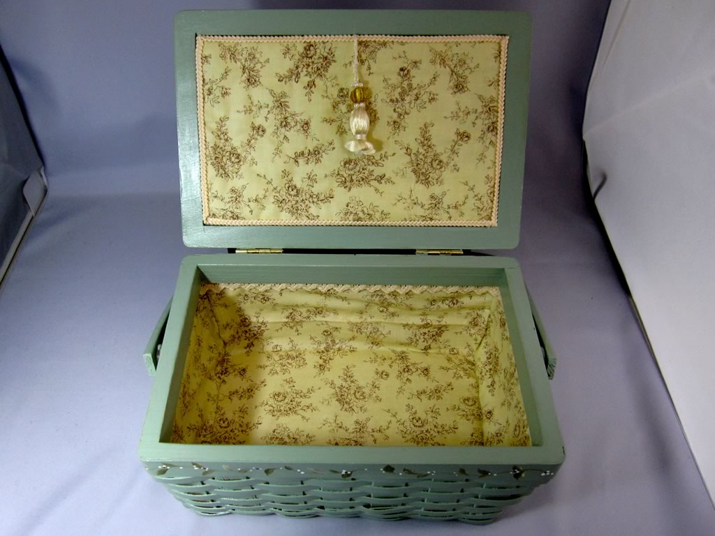 実際は布張りだったバスケットの上部に板をはめ込みペイントし,中も布張りにしてグレードアップ。