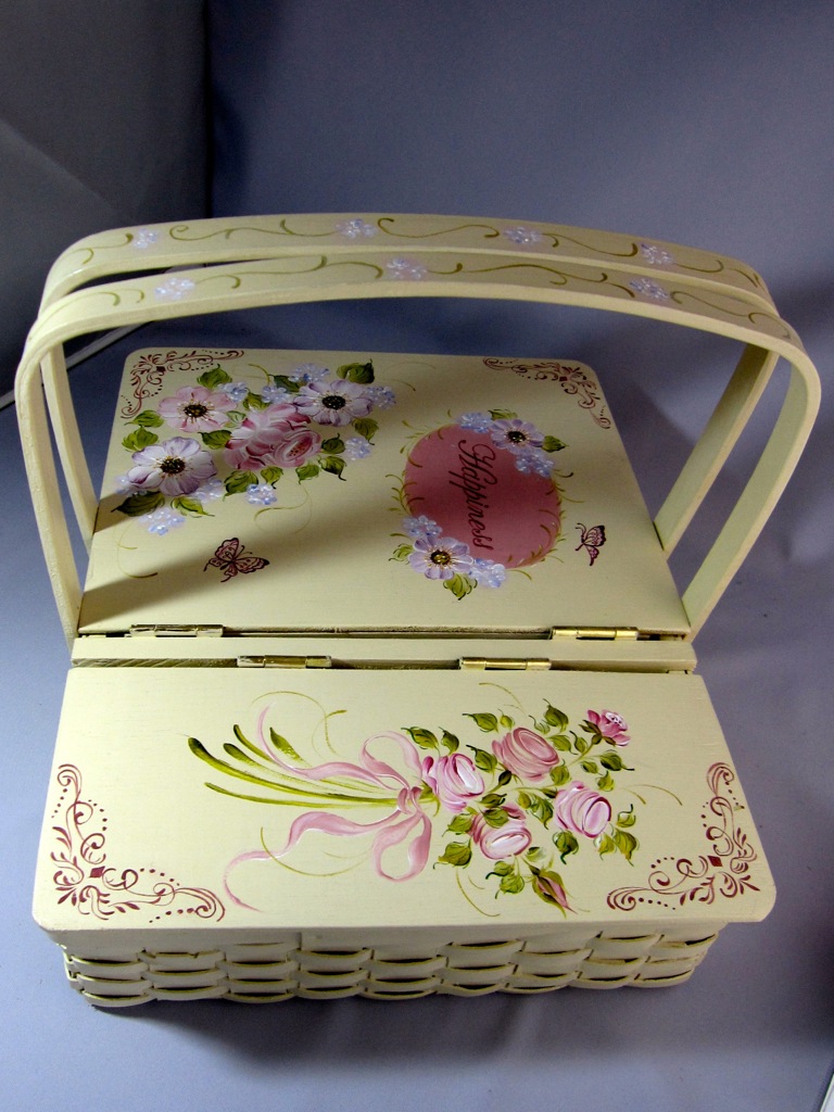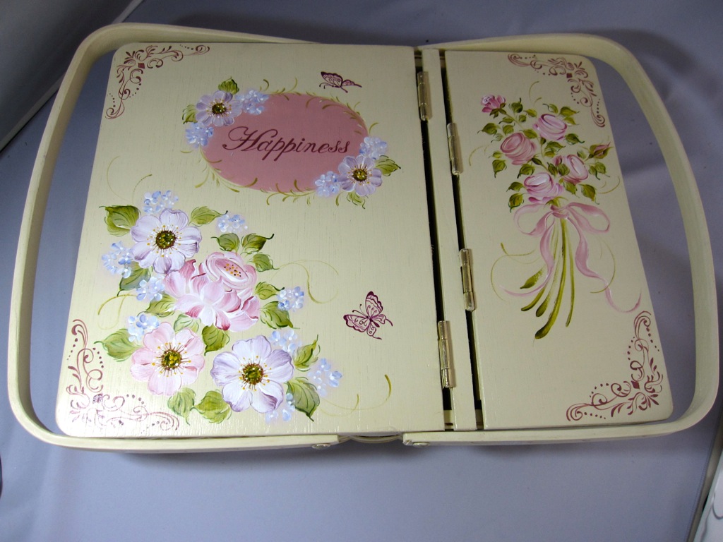 ちなみにアッセンデルフトとは17世紀にオランダで生まれたフォークアートで花や果物,鳥などの代表的なモチーフをすべてひと筆描きの要領でのびのびと描き,その色合いや重厚感などが楽しいペインティングです。木製品の生活小物をはじめ,あらゆる身の廻りのものから家具のリフォームまで多種多様です。