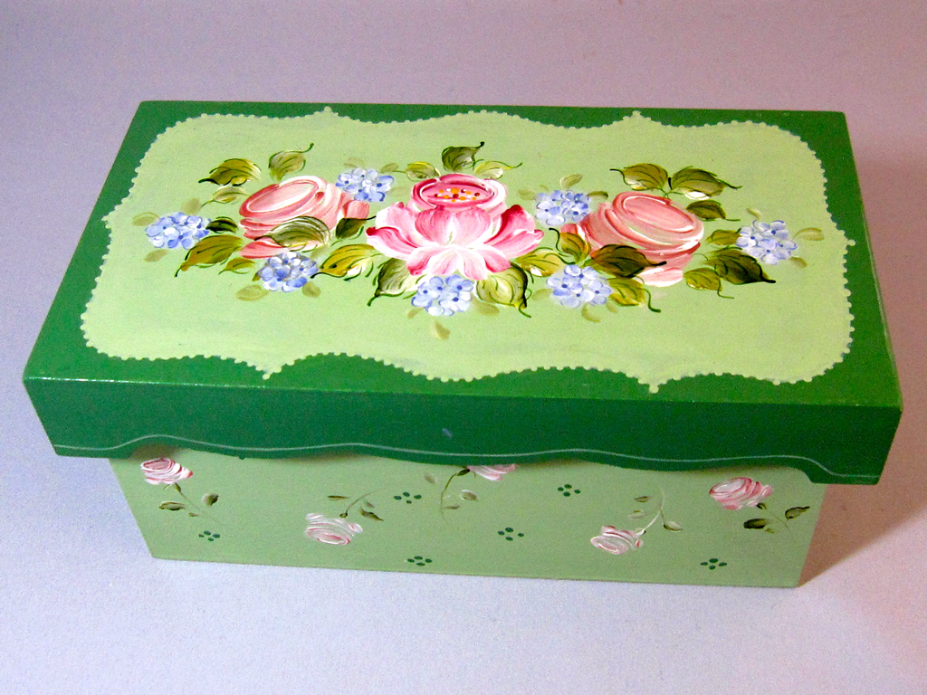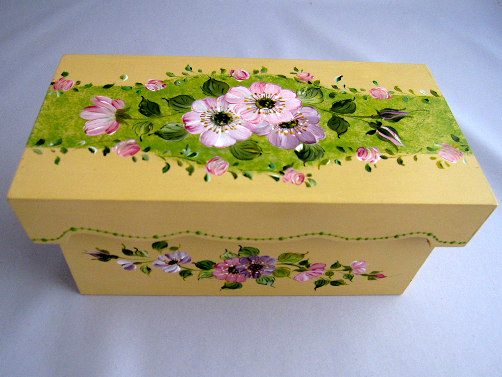 ちなみにアッセンデルフトとは17世紀にオランダで生まれたフォークアートで花や果物,鳥などの代表的なモチーフをすべてひと筆描きの要領でのびのびと描き,その色合いや重厚感などが楽しいペインティングです。木製品の生活小物をはじめ,あらゆる身の廻りのものから家具のリフォームまで多種多様です。