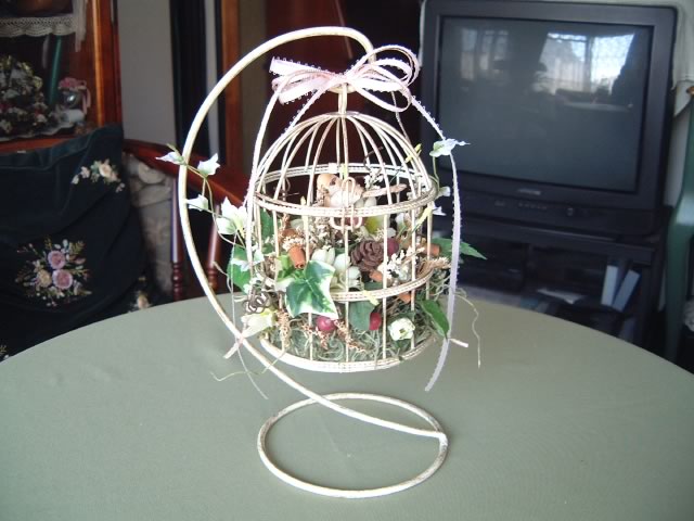 可愛らしい鳥カゴを主役に,花や木の実をあまり造りすぎずにアレンジし,最後に小鳥を入れてまとめました。